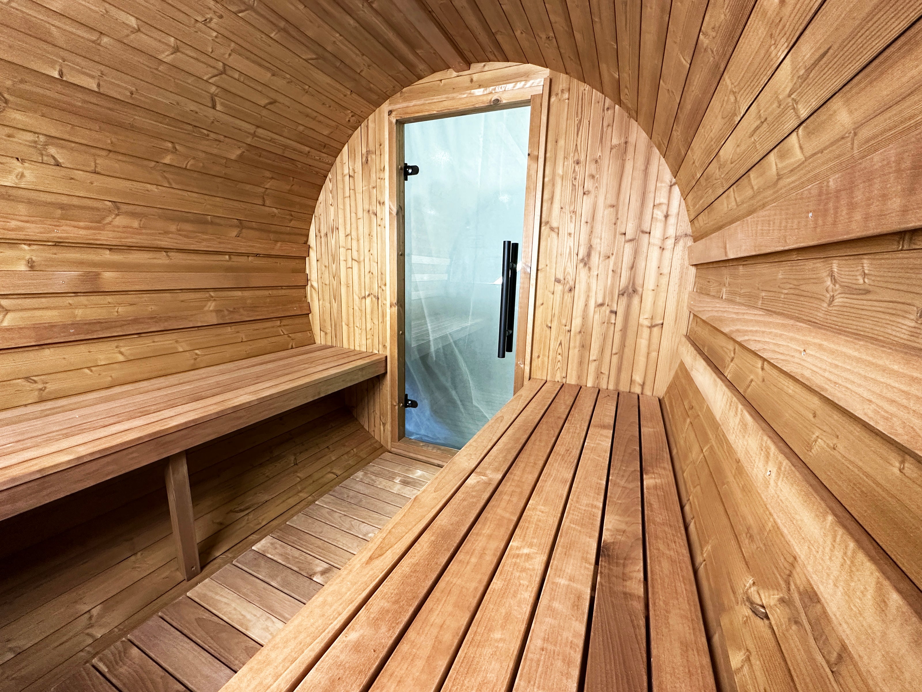 2-person, premium-quality DIY Barrel Sauna Kit with panoramic window. Natural light from the glass door and panoramic window illuminates this beautiful space. Includes comfortable benches for added convenience. Quality materials and superb engineering make this the very best outdoor sauna.