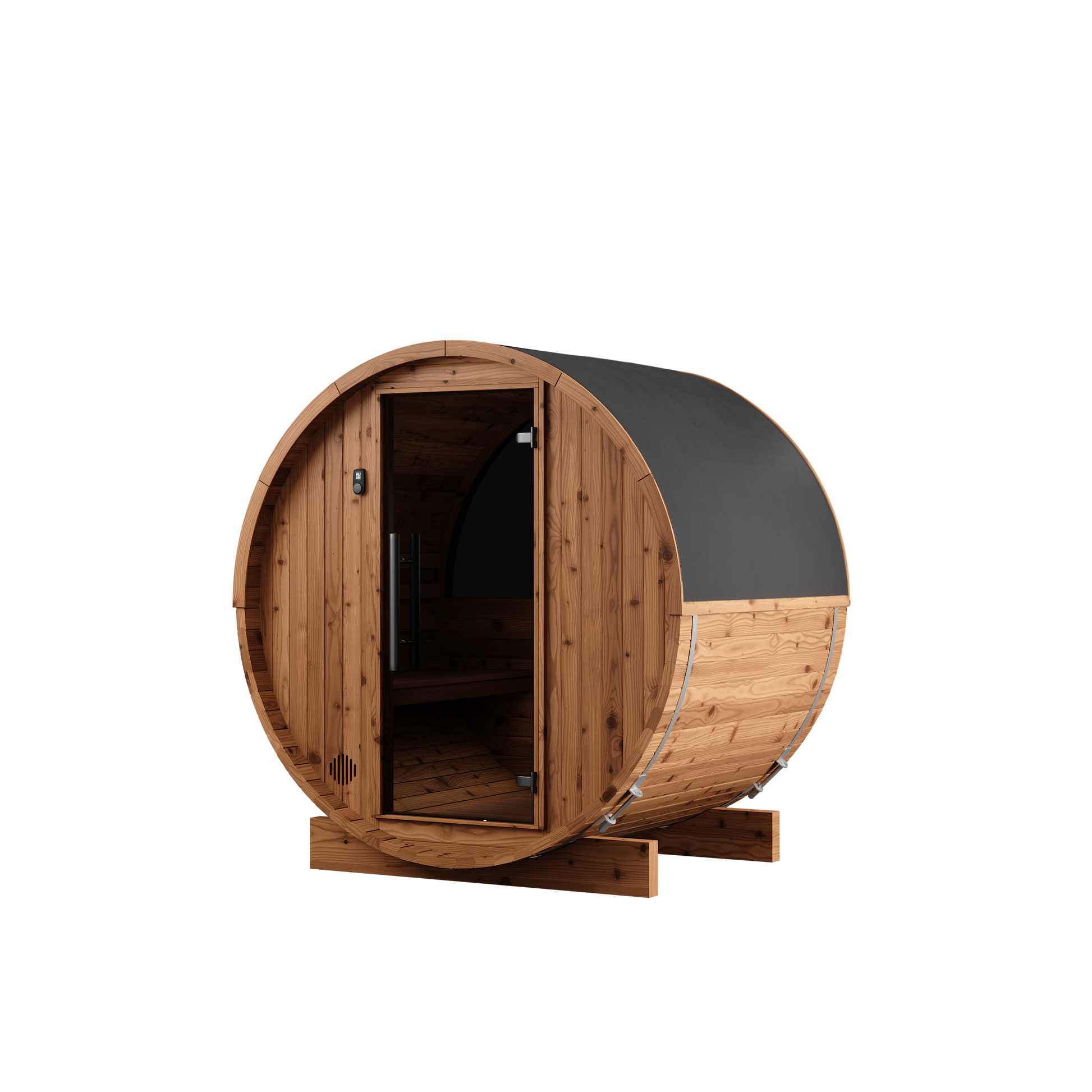 2-person, premium-quality DIY Barrel Sauna Kit with panoramic window. Natural light from the glass door and panoramic window illuminates this beautiful space. Includes comfortable benches for added convenience. Quality materials and superb engineering make this the very best outdoor sauna.