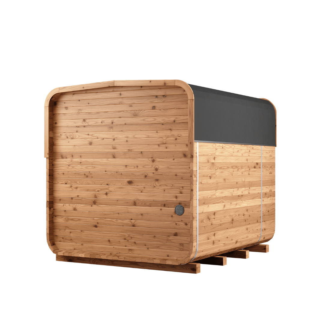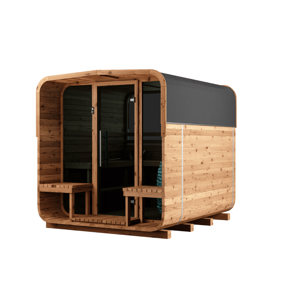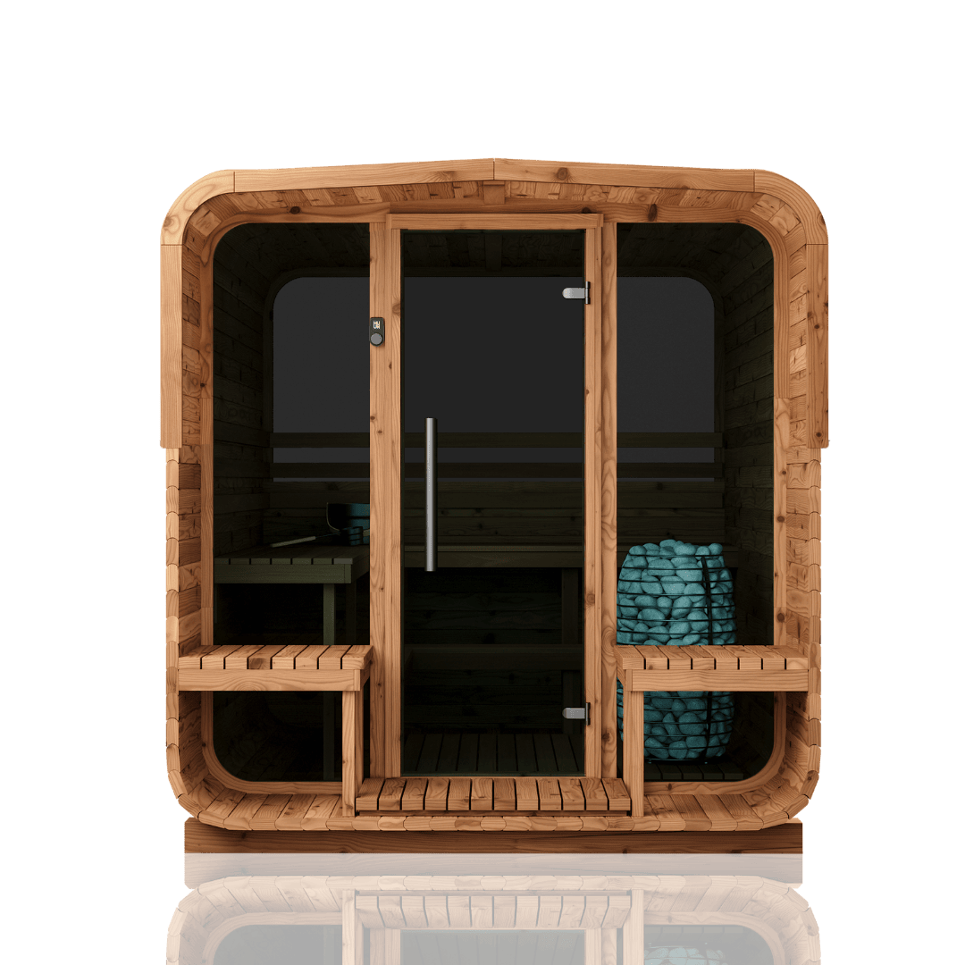 Nordic spruce gets a fresh look in a square silhouette with curved contours. Take in the view from the full tempered-glass front of your Thermory Sauna Square while you rest your feet on the tiered bench. Go ahead, stay awhile.