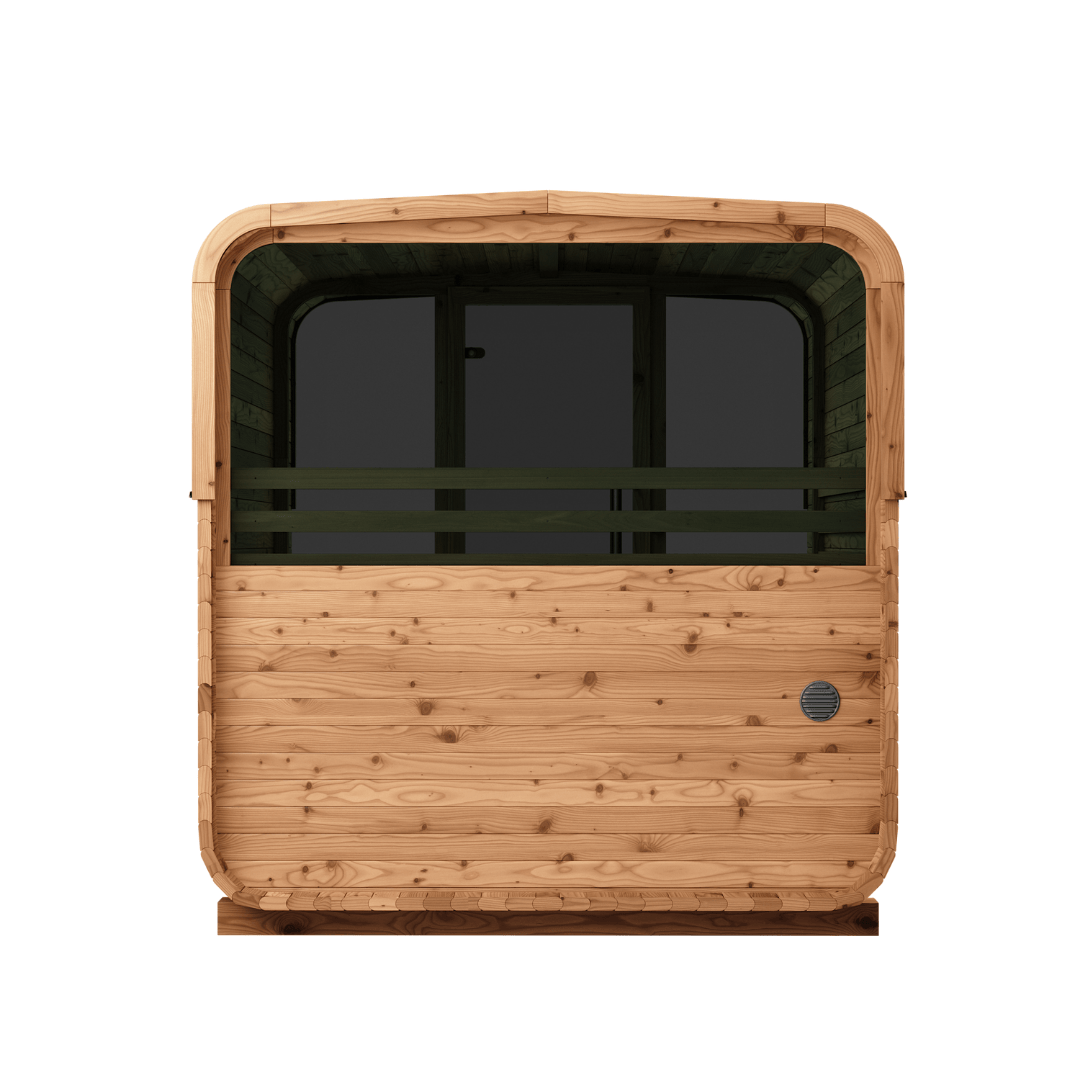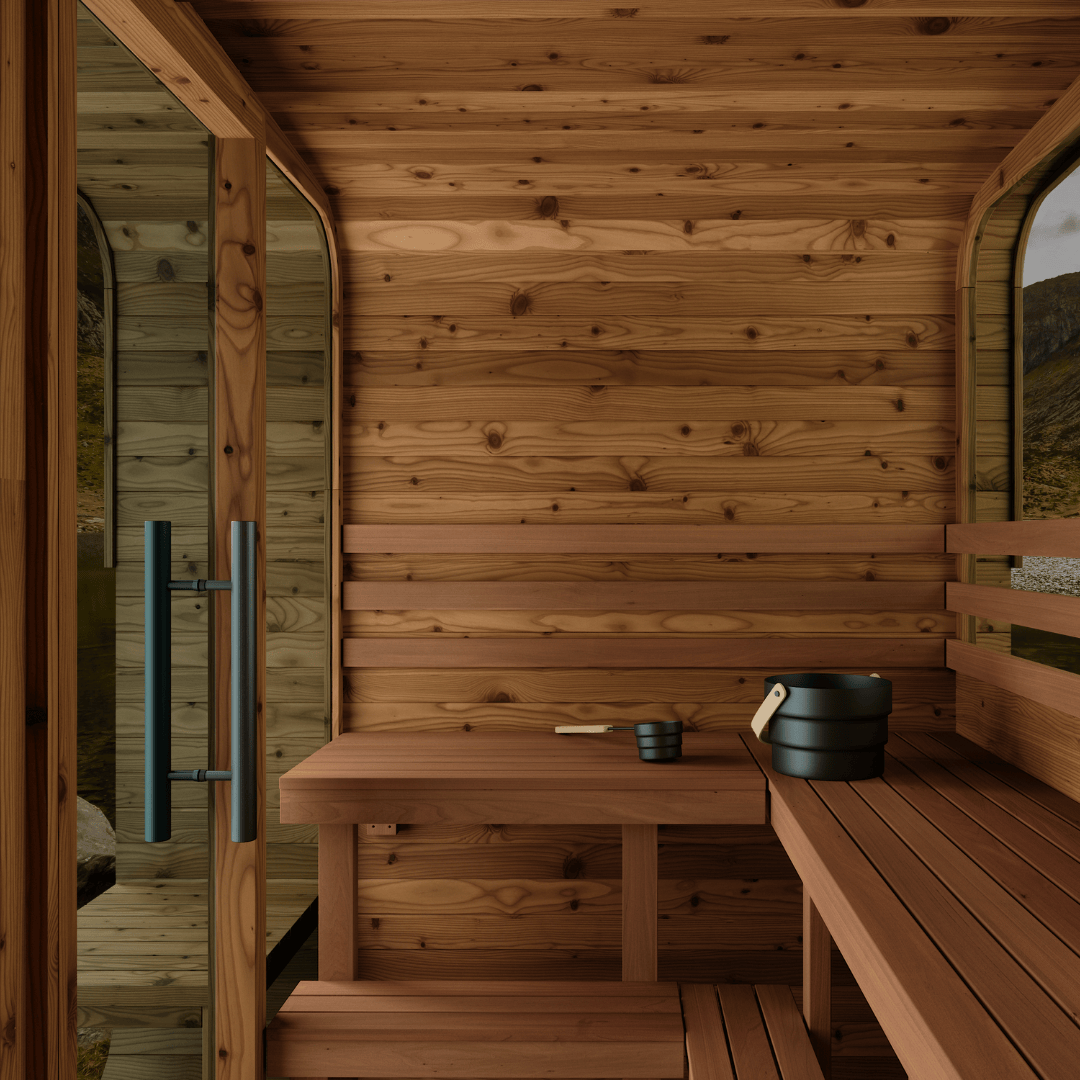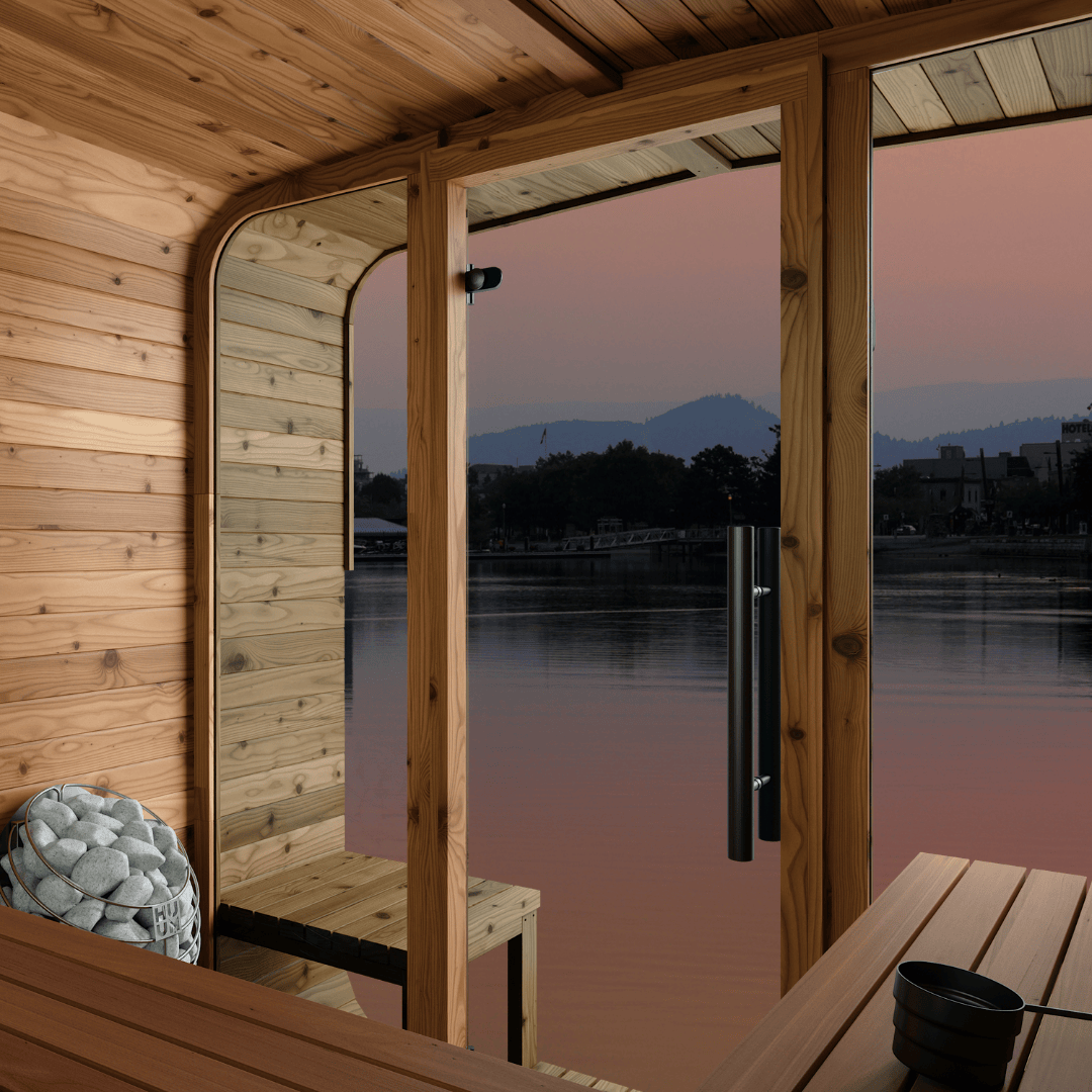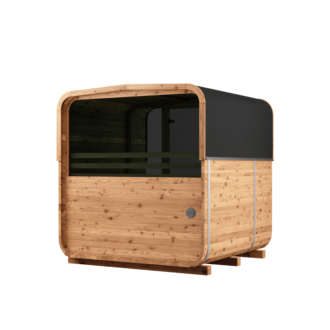 Nordic spruce gets a fresh look in a square silhouette with curved contours. Take in the view from the full tempered-glass front of your Thermory Sauna Square while you rest your feet on the tiered bench. Go ahead, stay awhile.
