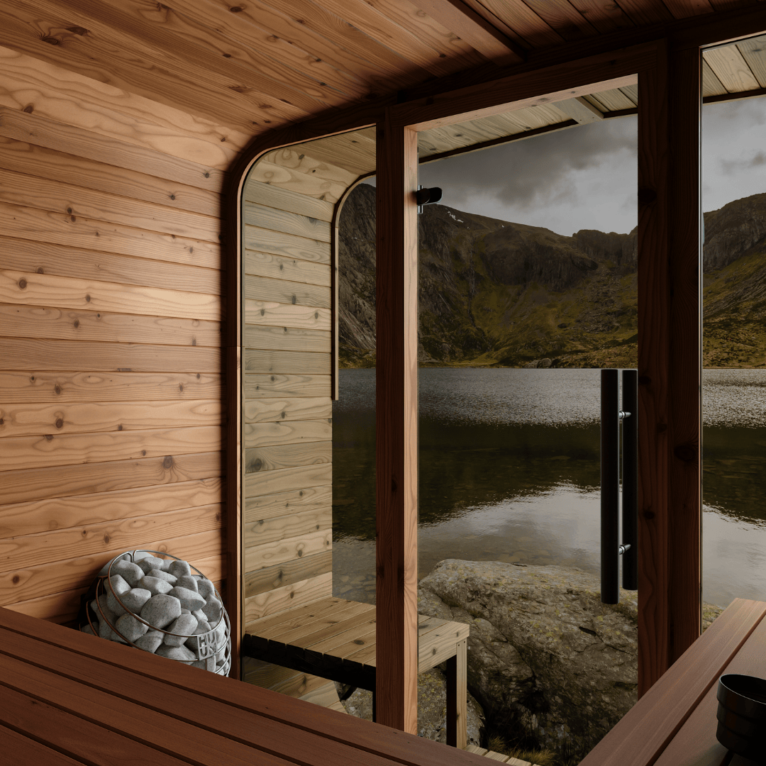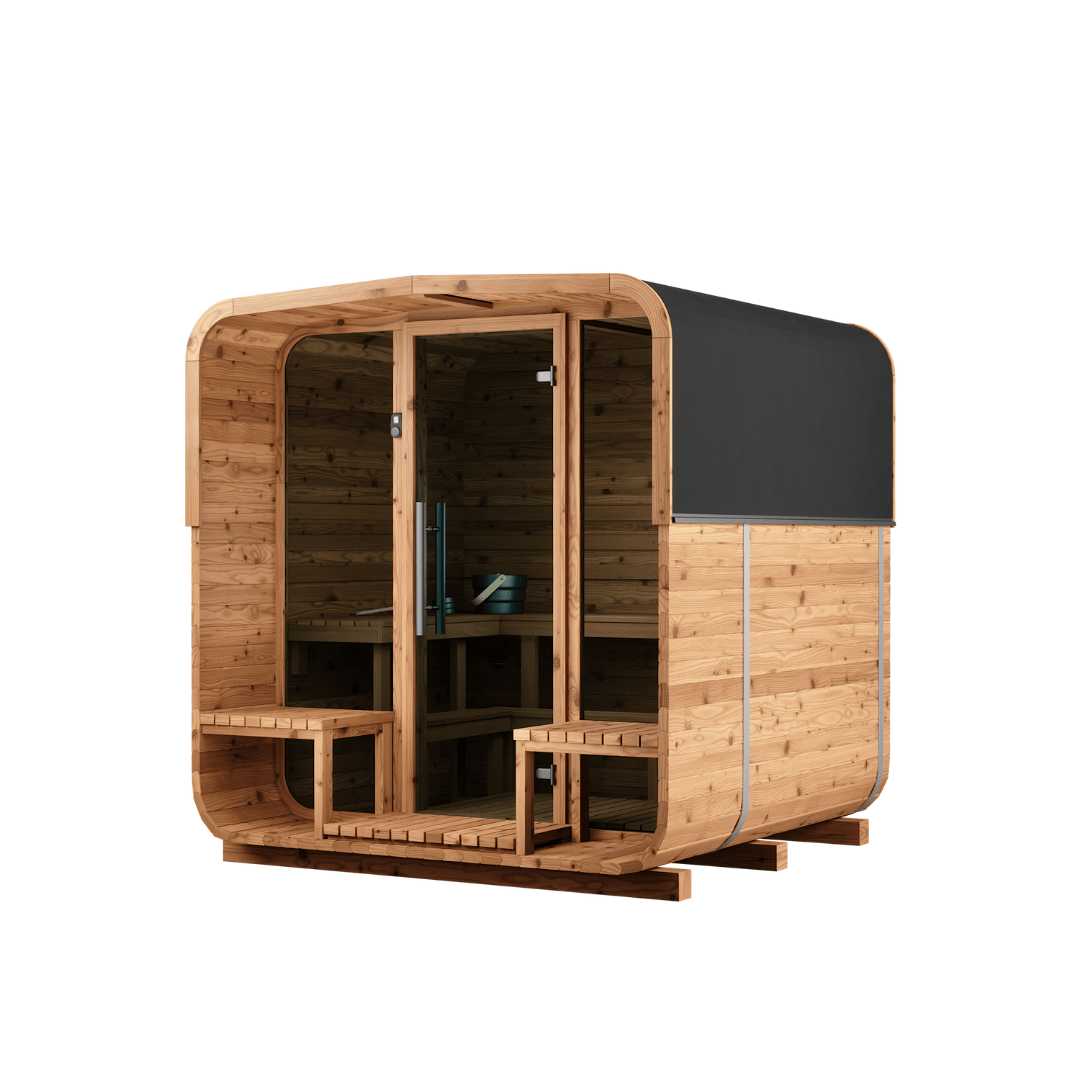 Nordic spruce gets a fresh look in a square silhouette with curved contours. Take in the view from the full tempered-glass front of your Thermory Sauna Square while you rest your feet on the tiered bench. Go ahead, stay awhile.