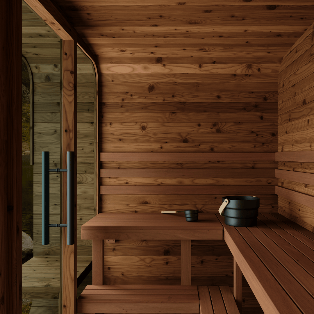 When you entertain in your Thermory Sauna Square, there’s never a bad seat in the house. Plus, you can rest your feet on the convenient lower bench.