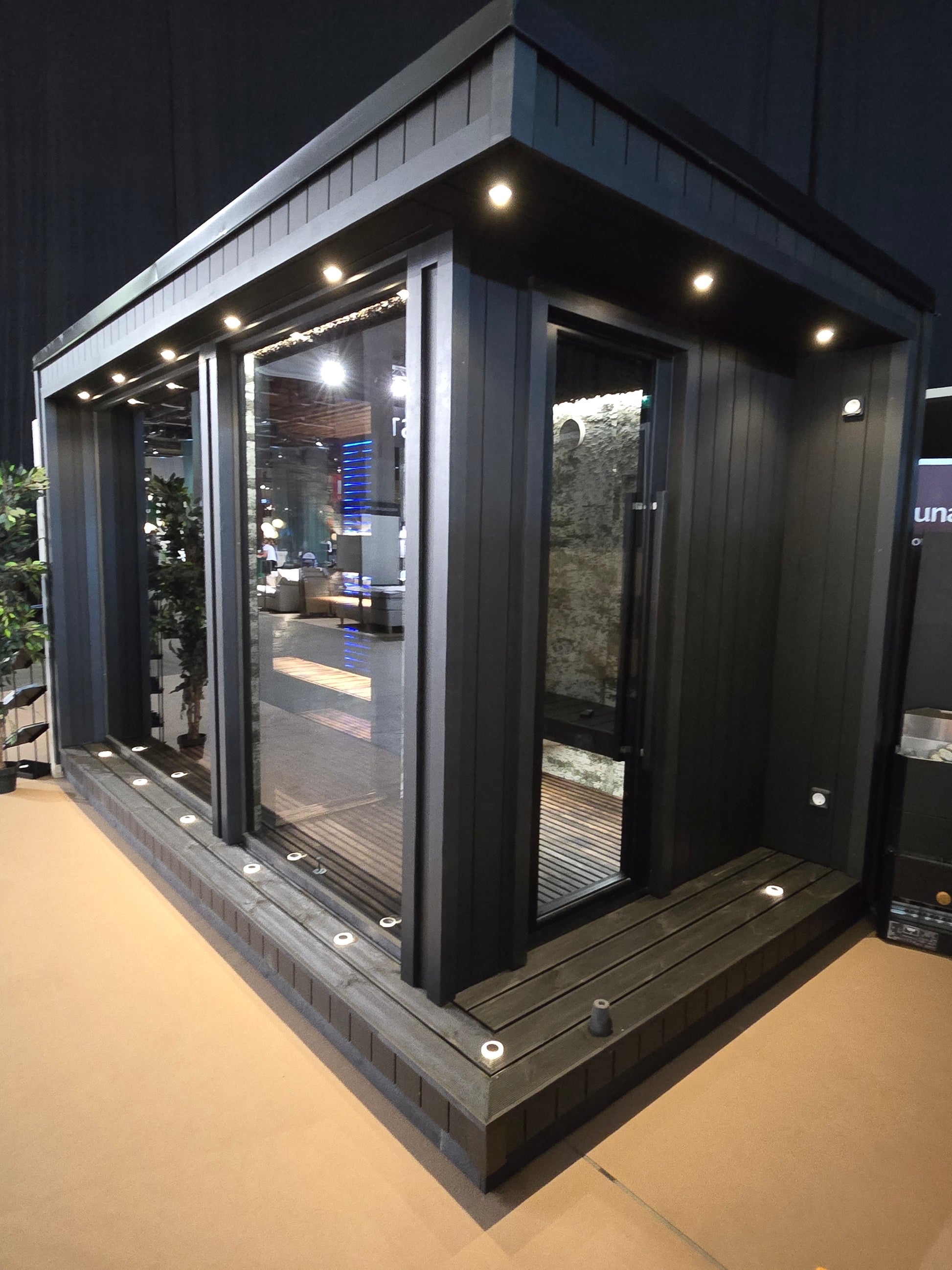- Interior finish:Â Hexagon Thermo Abachi Yakizugi brushed in steam room, hexagon thermo ash in pre-room